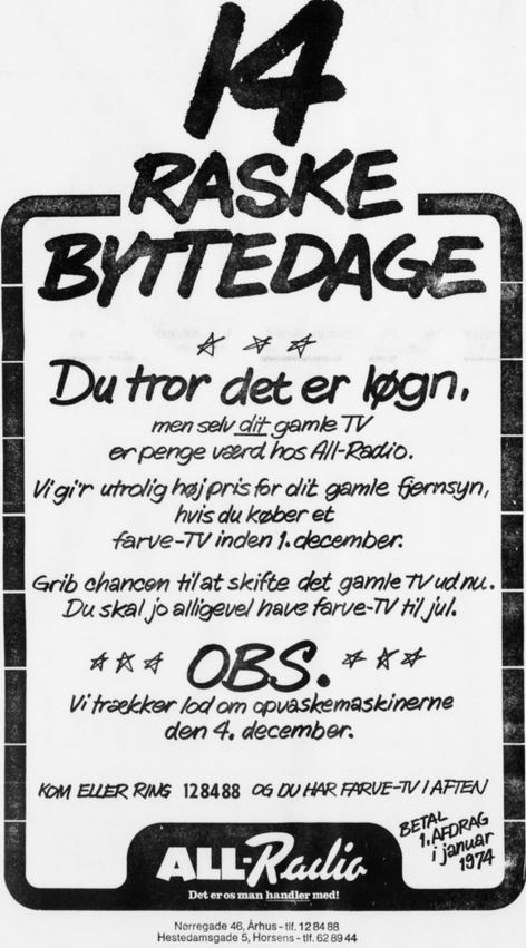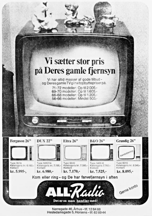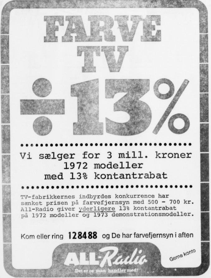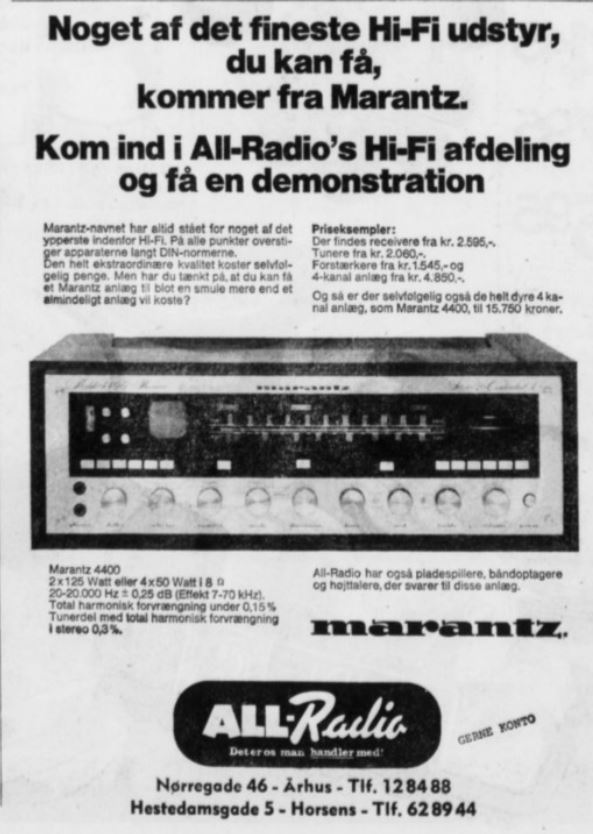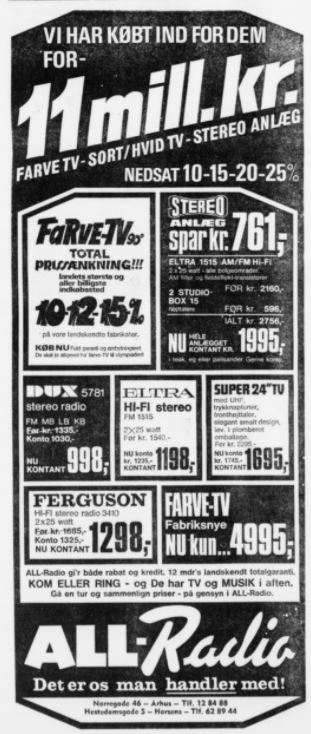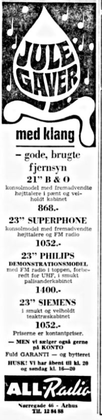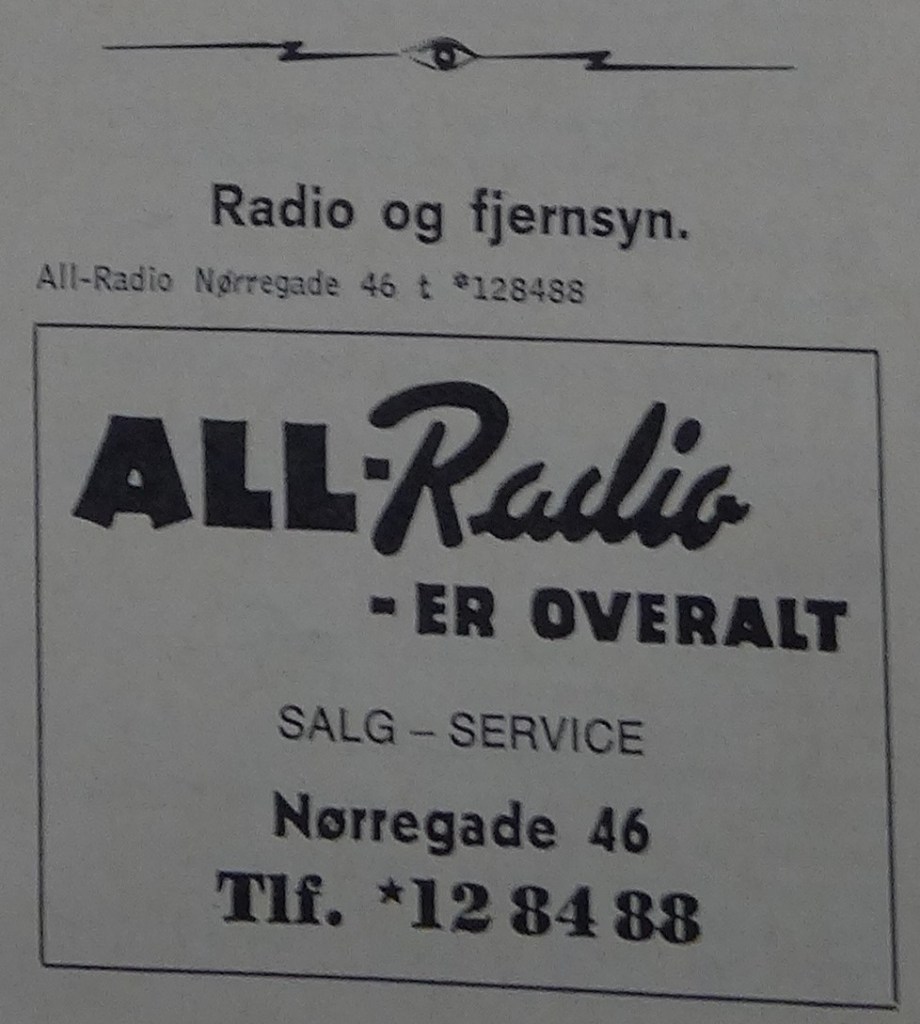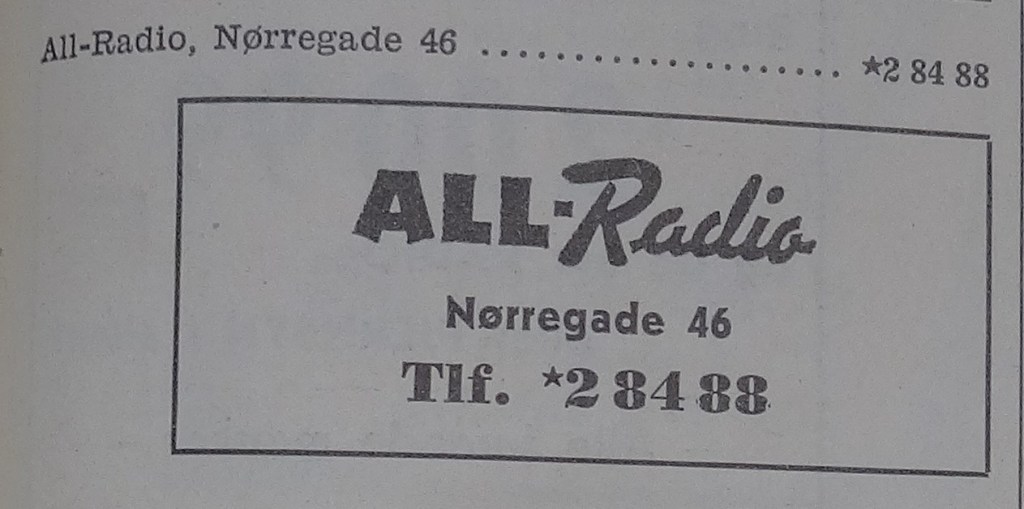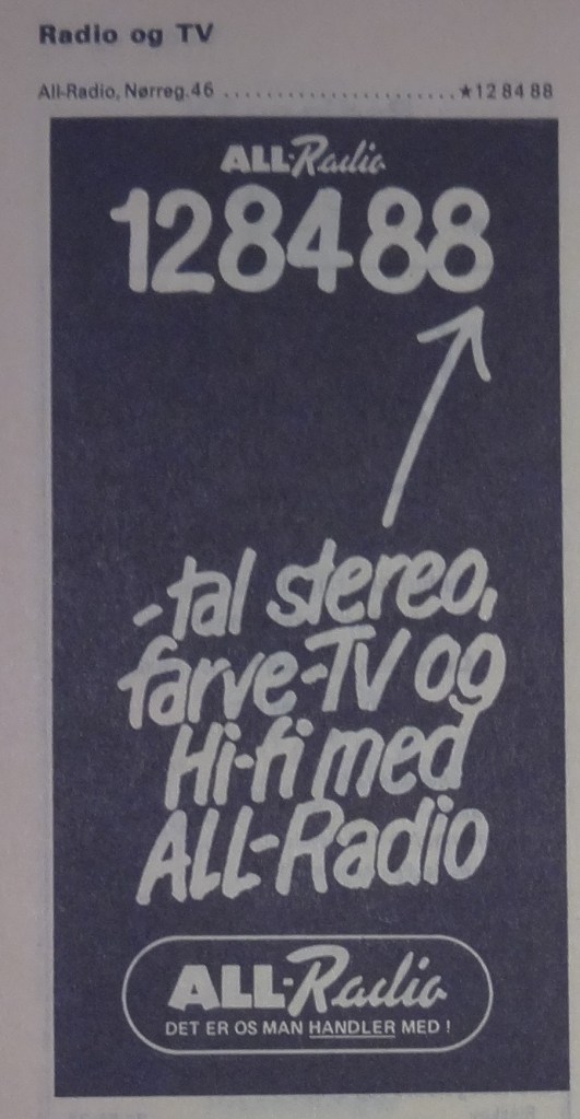 All-Radio (1960-1986) Nørregade 46 vfoto : Første annonce i telefonnøglen 1961-62 ÅS 28-01-1962 Aalborg Amtstidende 31-12-1961 ÅS 23-03-1965 foto : ÅS 05-12-1965 foto : ÅS 06-02-1966 ÅS 22-12-1968 foto : vejviseren 1969 foto : ukendt 1970’erne Demokraten 17-06-1973 ÅS 22-06-1972 ÅS 18-07-1972 foto : ÅS 31-12-1972 ÅS 15-11-1973 foto : Aage Kaiser, ca. 1970 foto : telefonnøglen 1974/75 ÅS 09-12-1975 foto : Thomas & Poul Pedersen, 1971 Populær Radio 1978-12-2 ÅS 25-11-1980 foto : Thomas & Poul Pedersen, 1982 foto : Sidste annonce i telefonnøglen 19785/86 Retur til de 13 Store >>>Retur til Forsiden >>> Kort over Radio Forretninger Del dette: Share on X(Åbner i et nyt vindue) X Del på Facebook(Åbner i et nyt vindue) Facebook Email a link to a friend(Åbner i et nyt vindue) E-mail Like Henter...