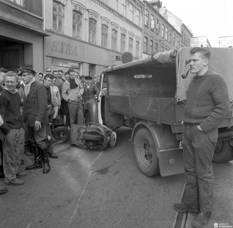 Firmabilen på synshallens område på Lystrupvej, efter uheld, foto : Jesper Pedersen 1972