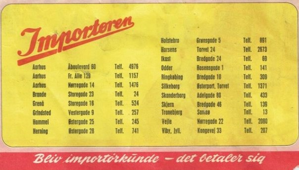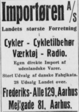 Importørens Udsalg, Mejlgade 81, Kongevej 33 (Skanderborgvej 180) Frederiks Allé 129, Åboulevarden 50 og Nørregade 14