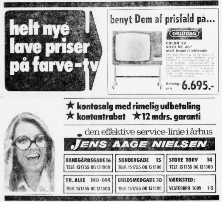 Jens Aage Nielsen’s adresser gennem årerne : Kongevej 19 (Hvor Danske Bank i Viby centret ligger i dag) Vesterbro Torv 1-3 Frederiks Allé 98 Frederiks Allé 140-144 Frederiks Allé 164 Nørregade 30 Banegårdsgade 16-22 Søndergade 15 M. P. Bruuns Gade 43 Store Torv 14 Fredensgade 54 (nok kun værksted)