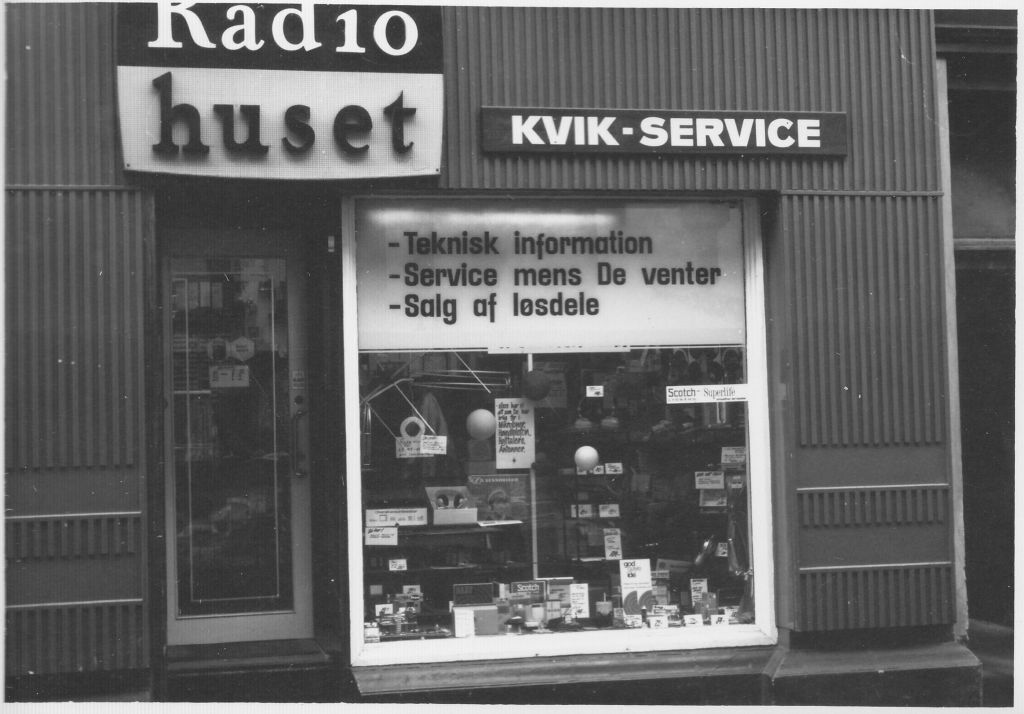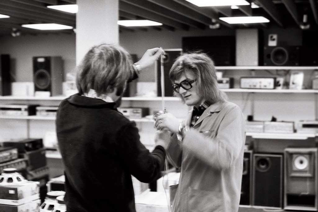 Leif Frydendahl med ryggen til og en radio mekaniker elev i butikken Radiohuset Expert Frederiksgade Århus foto Henning Frank Andersen