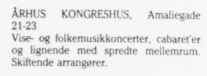 Aarhus Kongreshus 1908-1939 : Arbejdernes Forsamlingsbygning 1939-1991 : Folkets Hus ( se også denne ) 1991-2004 : Århus Kongreshus Amaliegade 21-23 1960’erne-1970’erne