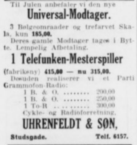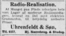 Uhrenfeldt & Søn, Cykel-, Cigar- og Radio forretning, Nørreport 19 (Hjørnet af Nørrebrogade og Studsgade) 1920’erne-1930’erne